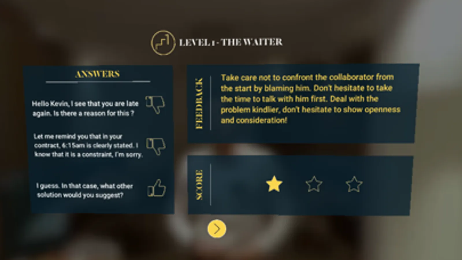 We have developed for you, Golden Tulip managers, a Virtual Reality experience to train yourselves about participative leadership using the tools above. We have also sent Virtual Reality glasses to all Golden Tulip hotels. Now, you just have to download the app “Playful Leader”, open the app, fill in your Genius ID and password to log in, and launch the module. Finally, you just have to insert the smartphone inside the Virtual Reality glasses and follow the instructions.