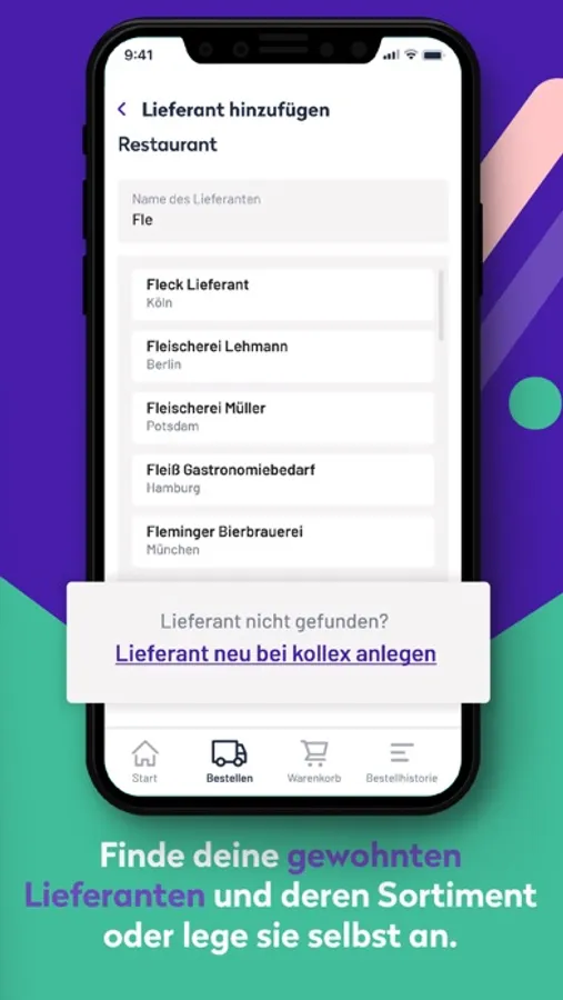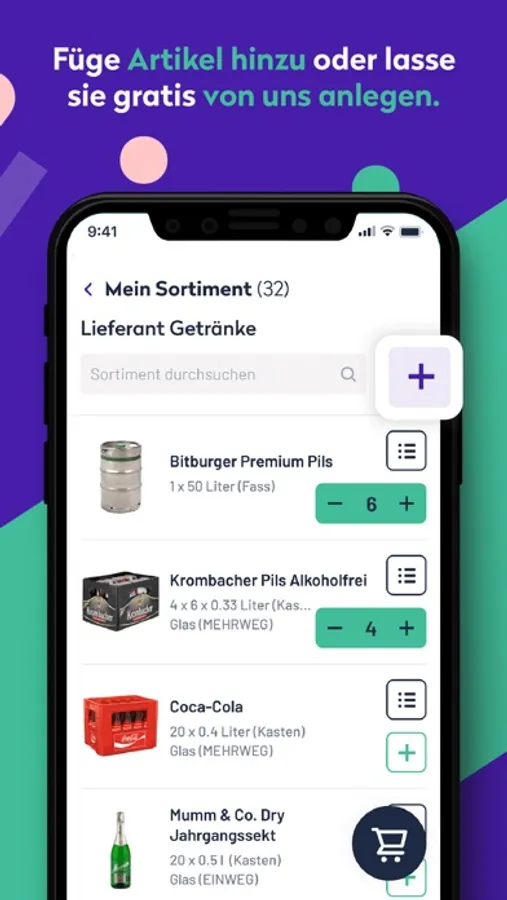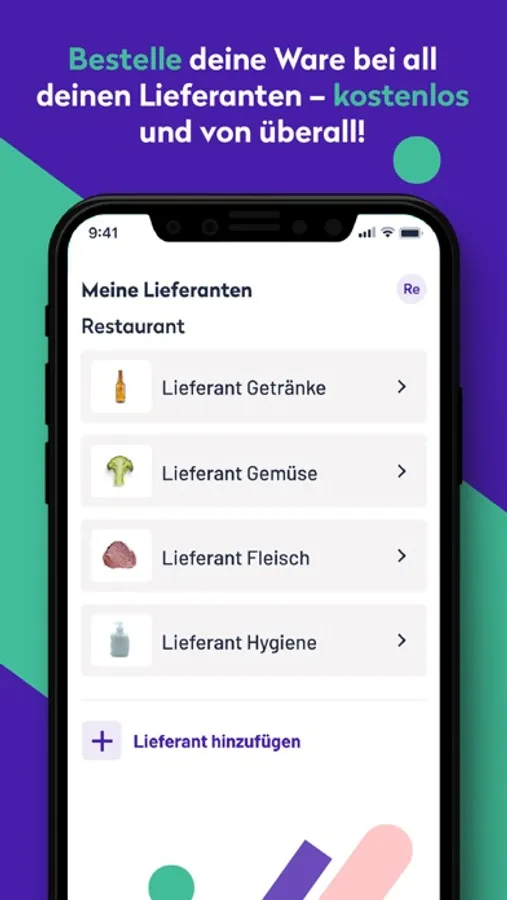 • Bestelle rund um die Uhr bei all deinen Lieferanten: Einfach Lieferanten in der App anlegen und Sortiment hinzufügen oder kostenlos von uns hinzufügen lassen.