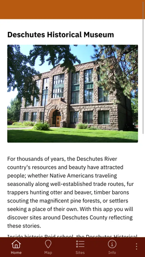 Put Some History in Your Future with the Deschutes County Historical Society. Explore the history of our region with the Historic Deschutes heritage app that alerts you to historic sites around the area, from Bend to Redmond, Terrebonne to La Pine, and Sisters to Brothers. Historic photographs and images of artifacts from the collection of the Deschutes Historical Museum reveal little known tales and hidden history, even buildings and places lost to time.