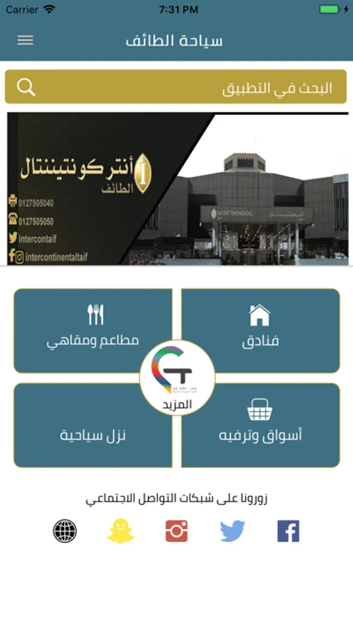 تم تصميم هذا التطبيق للمقيمين والزوار ليصبح التطبيق الأمثل للطائف بواجهه سهلة الاستخدام تسمح بالوصول إلى المعلومات وتصفحها بسهوله سواء "مستخدم أو مسجل"