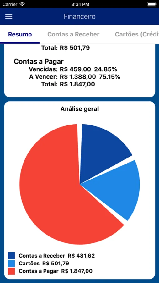 No financeiro é apresentado um resumo do contas a pagar, contas a receber e cartões, além disso você poderá ver o detalhamento de cada um destes itens.