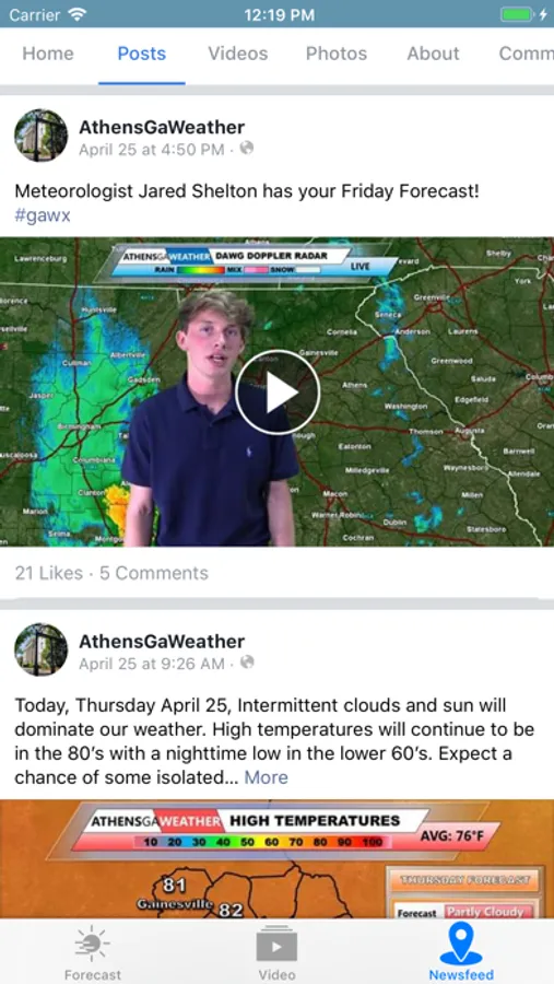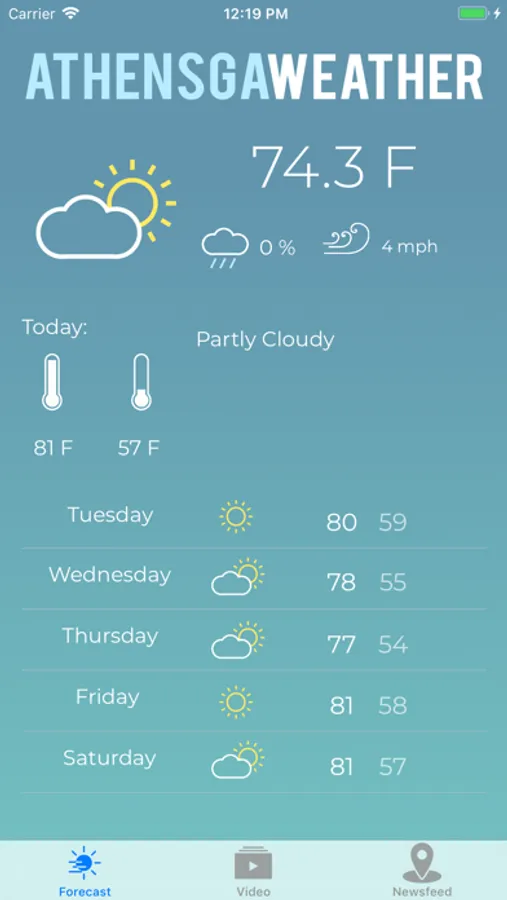 AthensGaWeather is a hyper-localized weather app developed to personalize the forecast experience for Athens created by Athenians. Since 2009, the University of Georgia geography department has served the local areas with daily, weekly, and emergency forecasts via their Facebook page with over 16,000 followers. AthensGaWeather is presented in an easy-to-use app with features such as: