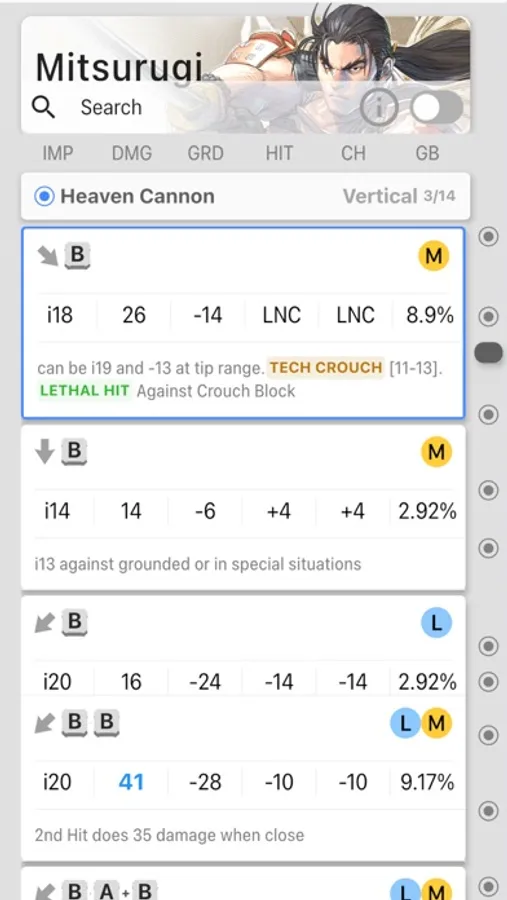 Select a character and view its frame data. You can filter, search and sort moves easily. Use the drag bar to quickly navigate to other categories like vertical or special attacks.