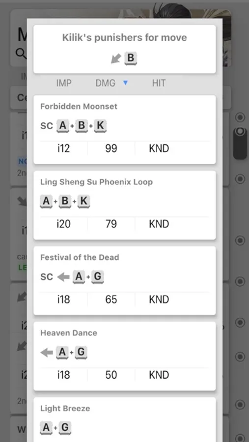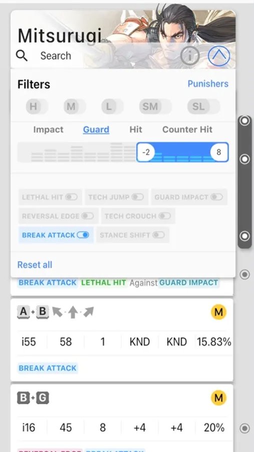 Select a second character to view all moves that can be punished from the second character. By clicking on one move, you will get all its punisher moves.