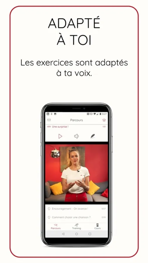 L'objectif de l'app est de te permettre de t'exercer et t'échauffer partout, 5 minutes par ci, 10 minutes par là, avant une audition, chez soi, sous la douche, en voiture, etc.
