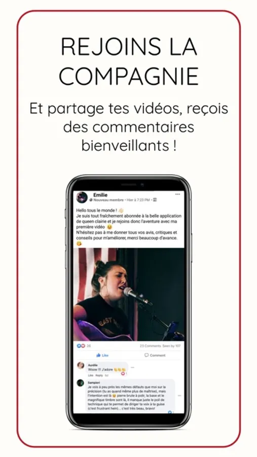 Tu pourras rejoindre notre groupe bienveillant de chanteur qui s'entraide ! On partage nos progrès, nos vidéos, on se commente les uns les autres, je donne des conseils, etc. Bref, c'est vraiment cool !