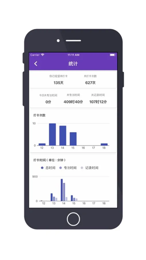 统计有打卡天数、打卡次数、专注时间、记录时间。图标展示近七天打卡次数和打卡时间。统计也区分总任务和单任务,可以区分查看。