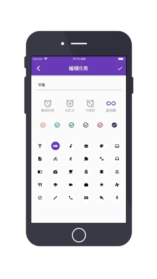 番茄指代时间记录功能。打卡任务可以设置不耗时、番茄时间(25分钟)、自定义倒计时、正计时几种时间形势。