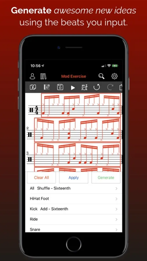 Generate new ideas (modifications) using beats that you input into the score. Choose from several modification methods: Add, Shuffle, Substitute, Permutate, Repeat, and Random. Modify individual parts of the beat (ex: kick drum only) or the entire beat if desired.