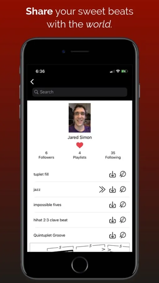 Upload your beats to your profile. Find and follow other drummers in the social network. Learn from them as you see and practice what they have uploaded to their profile.