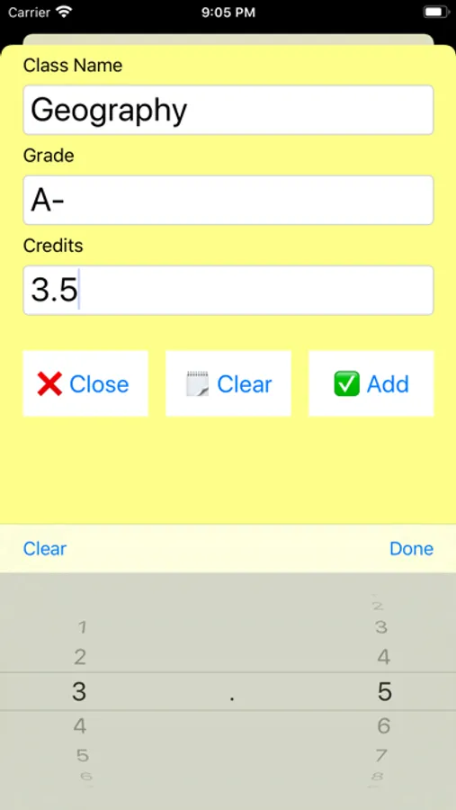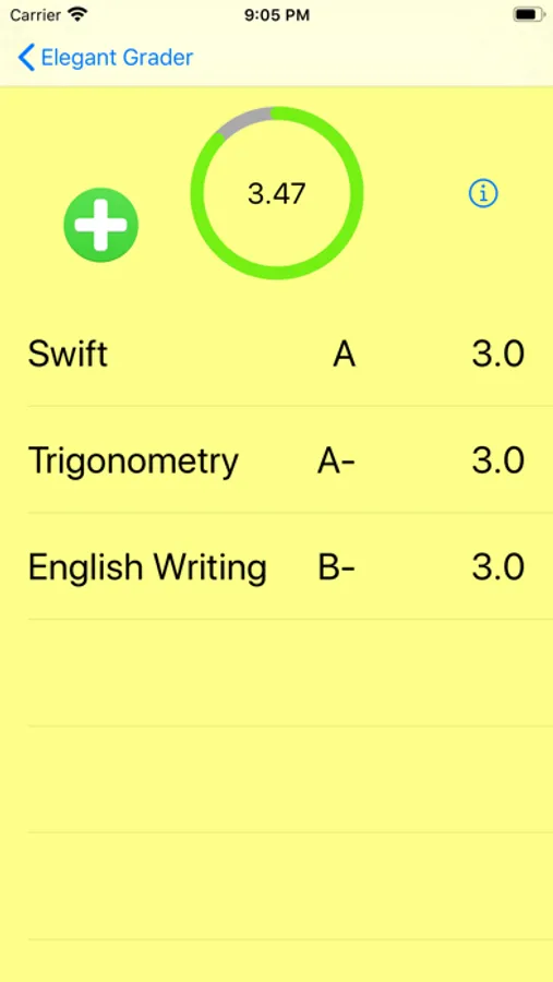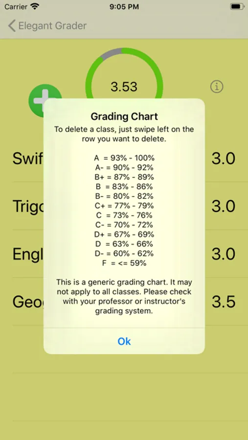 When using the score calculator, pop in the number of points you want to calculate and you’ll be given a grade according to the number wrong. You can either use a picker or a simplified numpad keyboard to quickly enter numbers. Toggling between decimal point percentages or rounding to whole number percentages can be done with a single tap! Want to include half points while calculating percentages? Another single tap and Elegant Grader will provide the data you need! You can calculate from 1 to 999 points. The GPA calculator allows you to input class names, grades, and number of credits to accurately calculate your GPA.