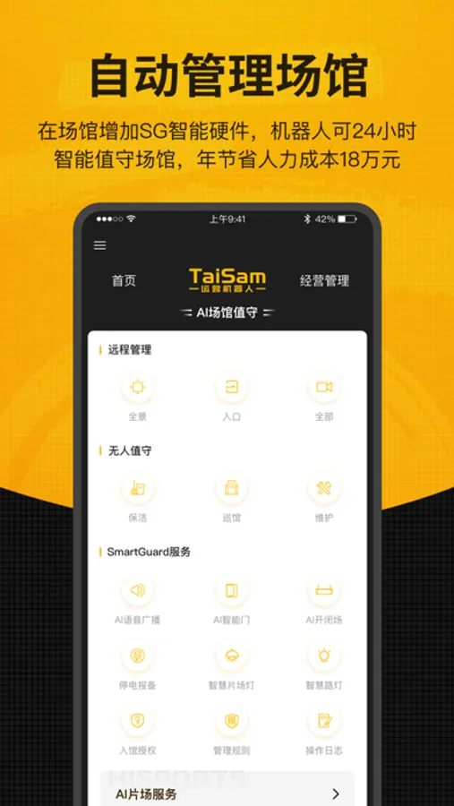 自动管理场馆:平台可为场馆投放SG智能硬件工程,机器人可通过SG为场馆24小时营业值守,将场馆升级为24h无人值守智能场馆,年节省人力成本18万元