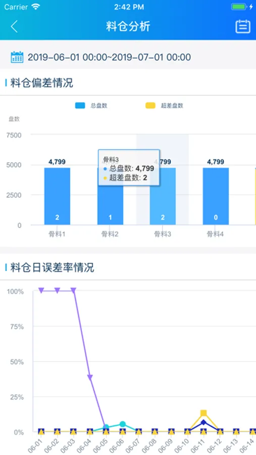 3、数据统计,生产、消耗原料数据一目了然,汇总自动统计。