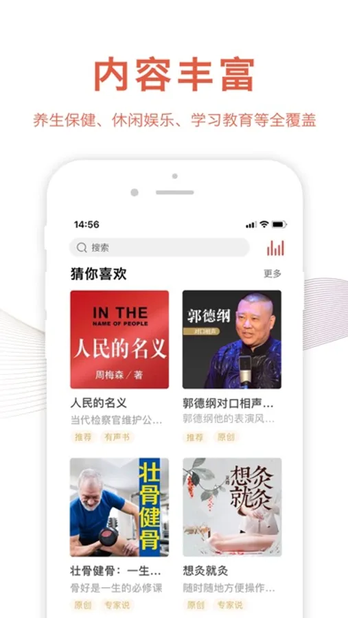 产品优势1.内容丰富,形式多样围绕老年人养生保健、生活休闲提供有声书、有声刊、精品课程、精品节目、特别专题等品类丰富、形式多样的音视频内容。