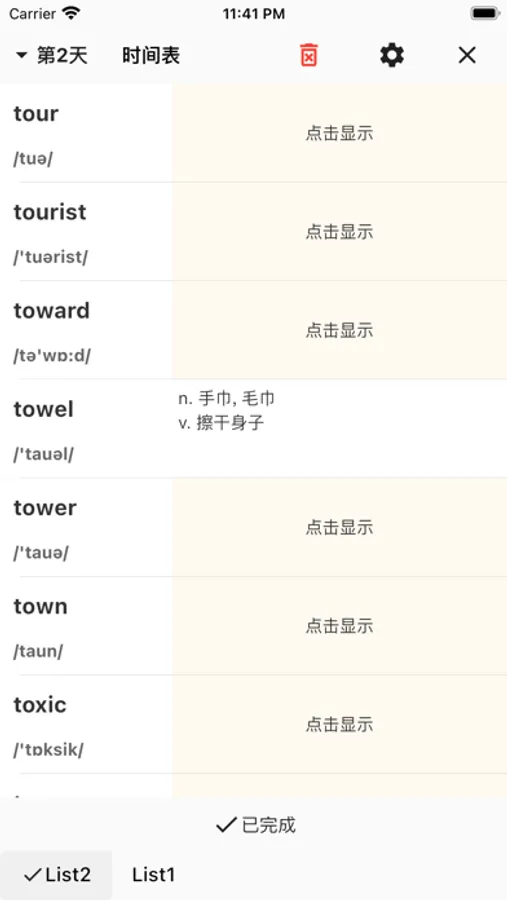 * 「List背单词」:根据艾宾浩斯的记忆规律,第一天记忆单词,后续的复习间隔周期为:第1天,第二天,第四天,第七天和第十五天,并由此制作每日所需记忆的单词计划表。