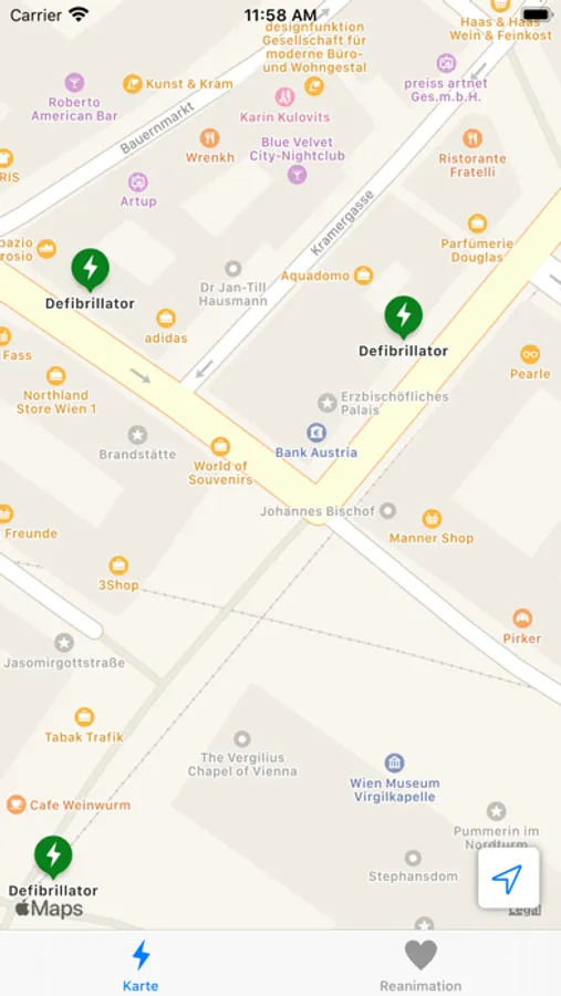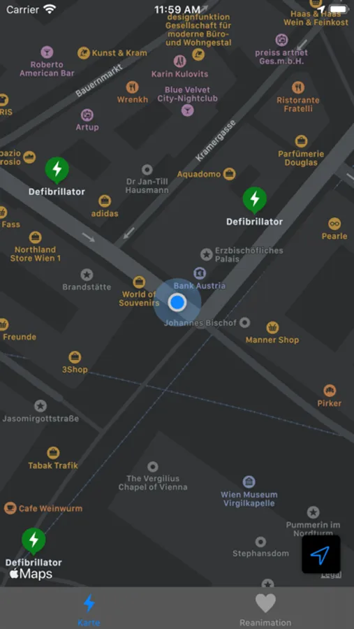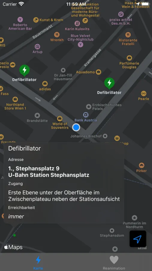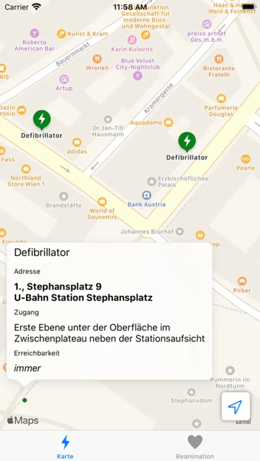 Shock zeigt nicht nur die öffentlichen Defibrillatoren inkl. Erreichbarkeit in Wien sondern gibt auch nützliche Tipps zum Reanimieren.