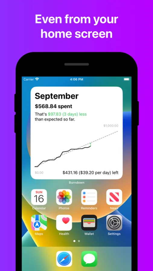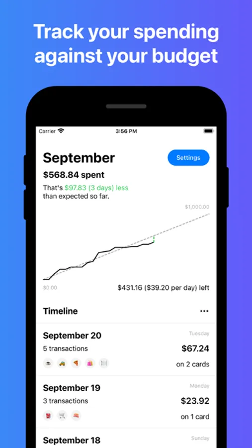 Budget Burndown is a simple personal finance app for tracking your monthly burn rate. Visually track your expected vs. actual spending rate across multiple cards on a single chart. If you keep the lines matched up, you're staying on budget. It's a quick and intuitive way to track your spending without all of the bloat that makes other budgeting apps so frustrating to use.