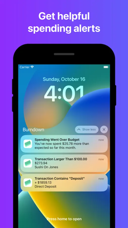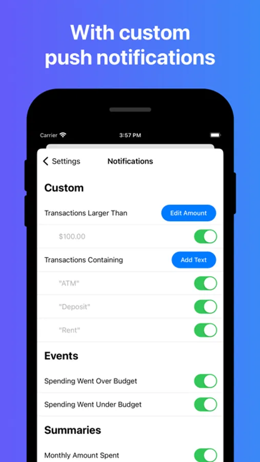Create custom push notification triggers. Set alerts for when a transaction is above a certain amount or contains specified text.