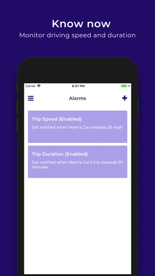 Don’t want your parent driving over a certain duration? Set a driving duration alarm and receive a notification when the vehicle is active for too long.