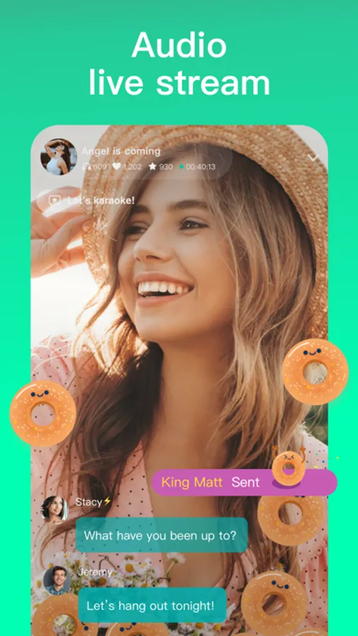 24/7 audio live streaming, meet a sweet voice. Instant chat, listen to singing, have fun together.