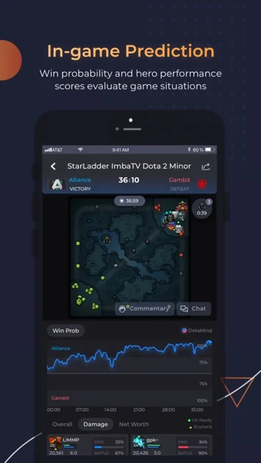 - In-game Prediction: Win probability and hero performance scores evaluate game situations.