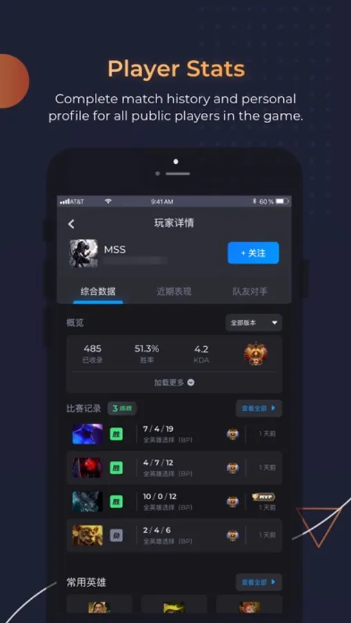 - Player stats: Complete match history, match performance score and personal profile for all public players in the game