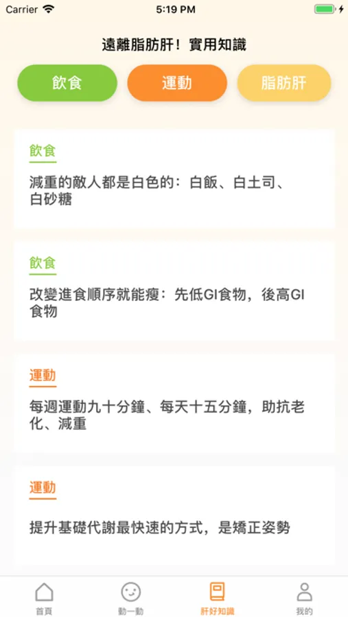 臺灣三分之一的成人患有國民病脂肪肝,無痛感讓人掉以輕心,嚴重時則易引發致命惡疾。然而除了改變生活型態少吃多動之外,脂肪肝至今無藥可醫。Liverwell 幫你隨時簡單動一動活化身體代謝,勝過短期且易加速老化的苦戰式減重。針對個人時程作息推薦簡單具實用目的的運動如久坐伸展、預防腰痛、看電視順便做、睡前舒緩等,降低門檻提升動機;累積運動量讓成就可視化。