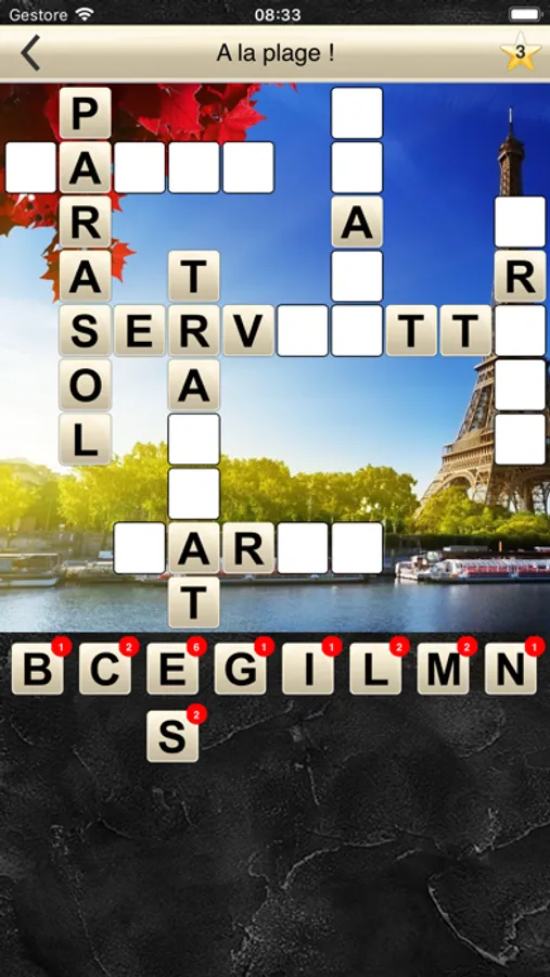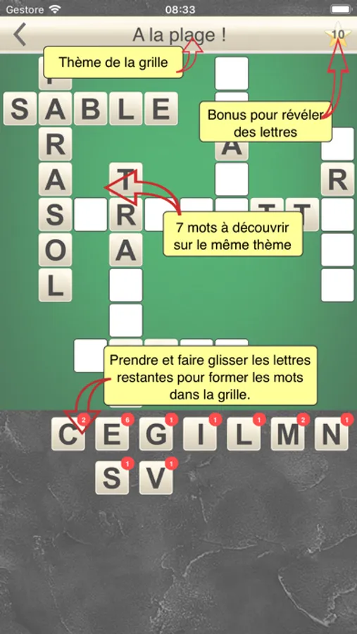 Toutes les lettres qui composent la grille sont affichées en bas de votre écran. Prenez-les simplement avec votre doigt et placez-les dans la grille pour former les 7 mots à trouver.