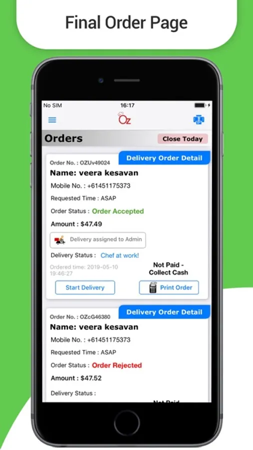 After Rx admins receive a new order, they can allocate a delivery driver to deliver the food in the Admin app. Driver should login to the OZ admin and check the delivery in the driver’s order list. The delivery drivers should press the “Start Deliver Button” in the app before commencing to deliver. After the delivery, the driver should take signature of the customer in the App signature pad and press submit. Once the process is completed, the Admins can re- route the drivers to other delivery areas.