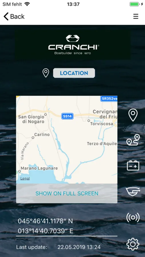 Stay connected with your Cranchi-Boat! Connect via App to your boat and keep an eye on it at all times! Verify the position of your boat at any given time, view the status of the battery and bilge pump and have easy access to all your trips immediately via your smartphone.