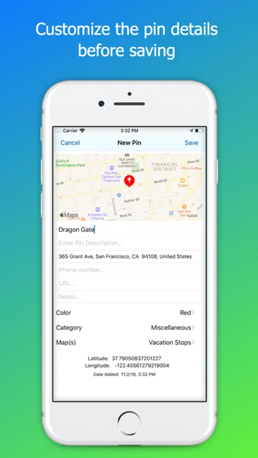 Customize your pin details. We now offer 19 colors and 47 custom categories to choose from. You choose the pin color, glyph, category, name, and description. You'll also be able to see the pin's GPS location and the date/time it was created. Once you save a pin, use Apple Maps or Google Maps (if installed) to get you there. Just a couple taps and you're on your way!