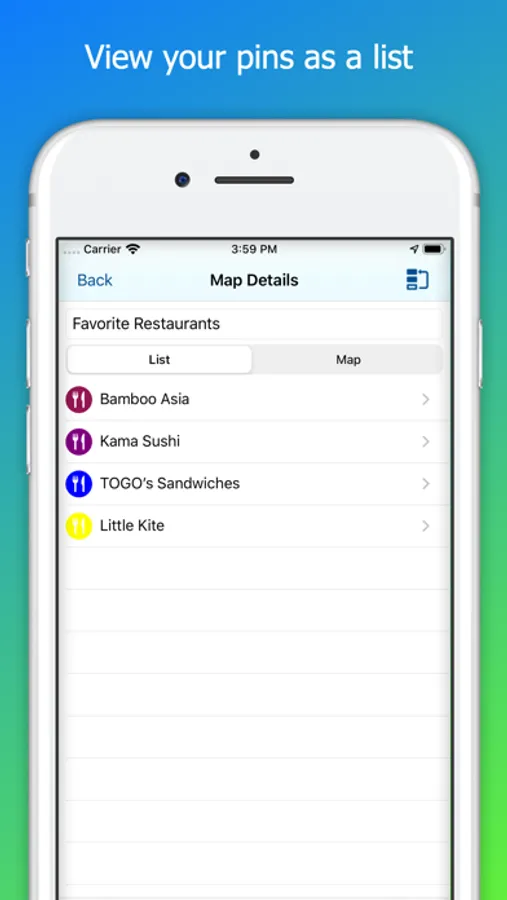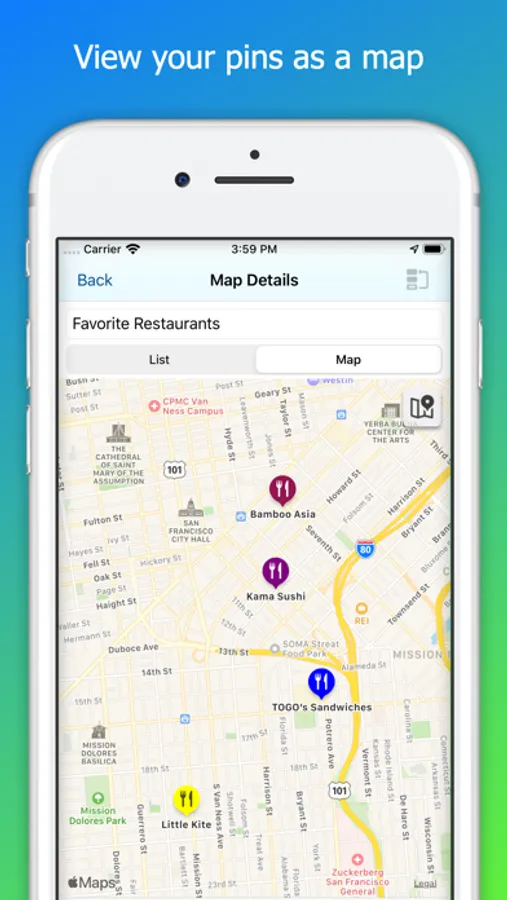 • View the pins in a custom map as a list or overlaid on a map