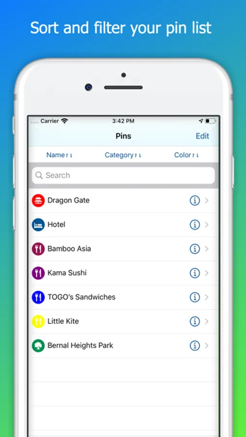 • Sort your pin list by name, color, or category