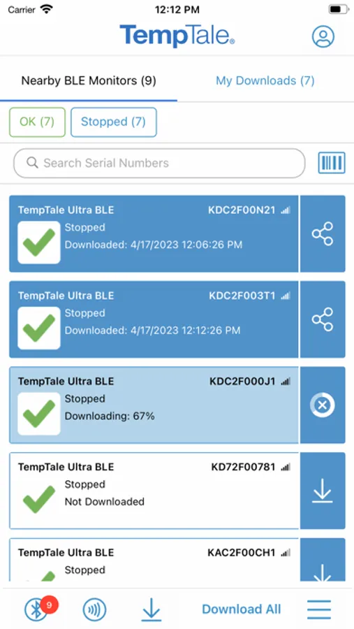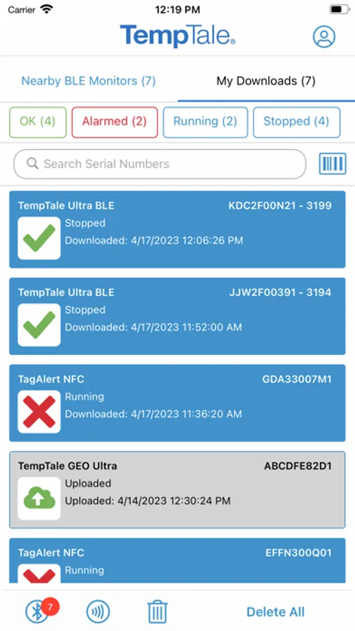 Once the app is installed on your smartphone, • Simply launch the app and the TempTale® BLE (Bluetooth) monitor will broadcast to the app (no pairing required). Click download arrow to download to your phone. Use the app for near field communication (NFC) to scan the TagAlert® NFC or TempTale® GEO Ultra by holding your smartphone and tapping the monitor—it will be read automatically.