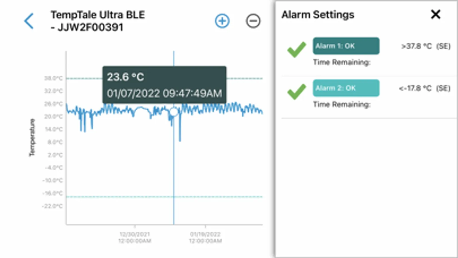 • TempTale® BLE and TagAlert® NFC monitors can be programmed with up to six (6) temperature alarms and displayed in the app. TempTale® GEO Ultra alarms displayed in the software, login to ColdStream® Select / SensiWatch® Platform to check for shipment alarm status information.