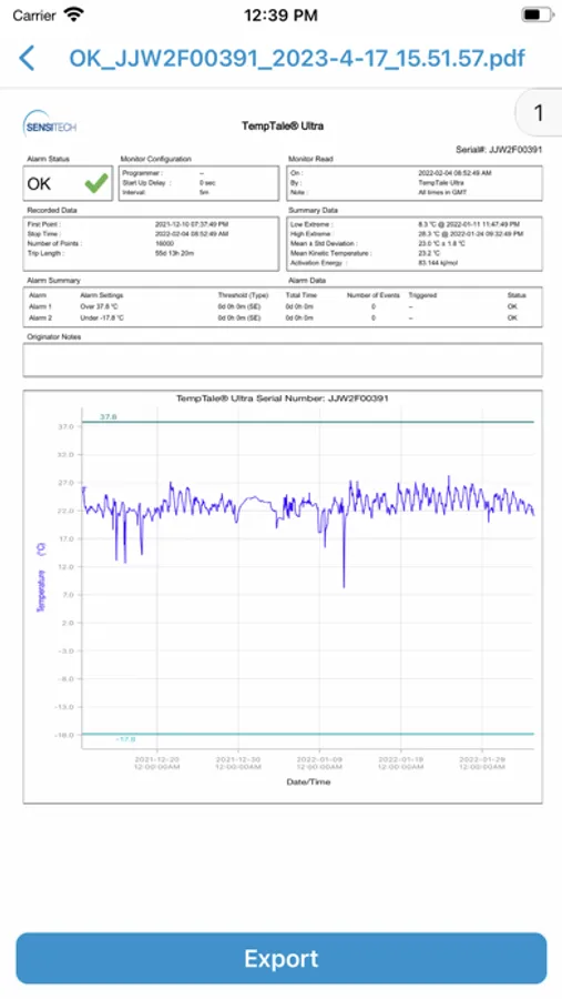 Provides an easy-to-understand temperature status of your package. The read out indicates if the product has stayed within acceptable limits or if any temperature alarms have triggered. Once the app is installed on your smartphone, simply open it and tap the device to scan and read the TagAlert® NFC to check alarm statuses. Once data is downloaded using the app, feel confident in your accept/reject decision. Quickly export data reports in PDF format and send them using your smartphone file sharing options.
