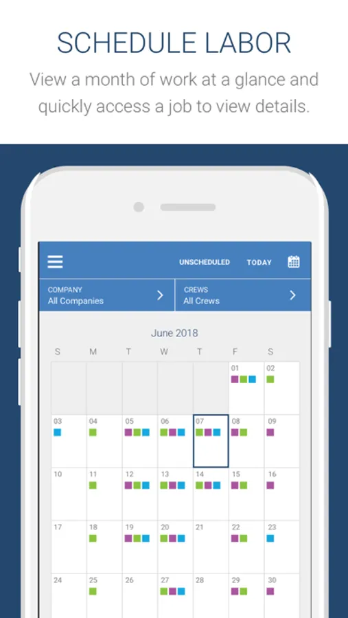 The calendar view shows a quick snapshot of work scheduled for your crew(s). The list view displays the most important details of the jobs scheduled to your crew(s) such as the job number/name, the scheduled start time, the job site address, and crew assigned all at a quick glance. These views also allow you to filter the data to narrow down the results shown.
