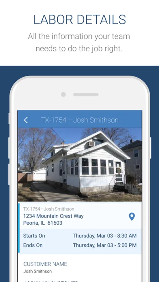 Labor Orders in AccuLynx are shared to the app and displayed in a user-friendly view, providing access to important information including the job site address, scheduled start date/times, labor order details, instructions, and checklists.