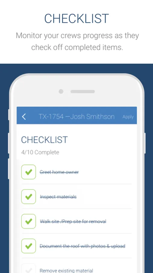 • Assigned Checklists can be completed in the app as progress is made at the jobsite, giving managers a real time update and ensuring all tasks are accounted for without actually having to be at the jobsite