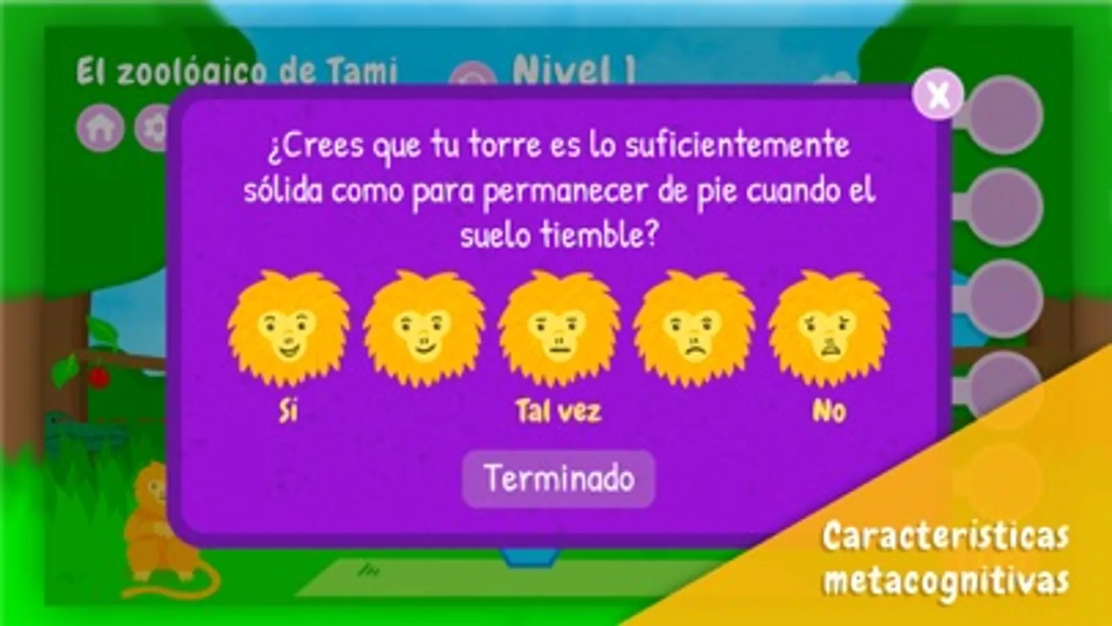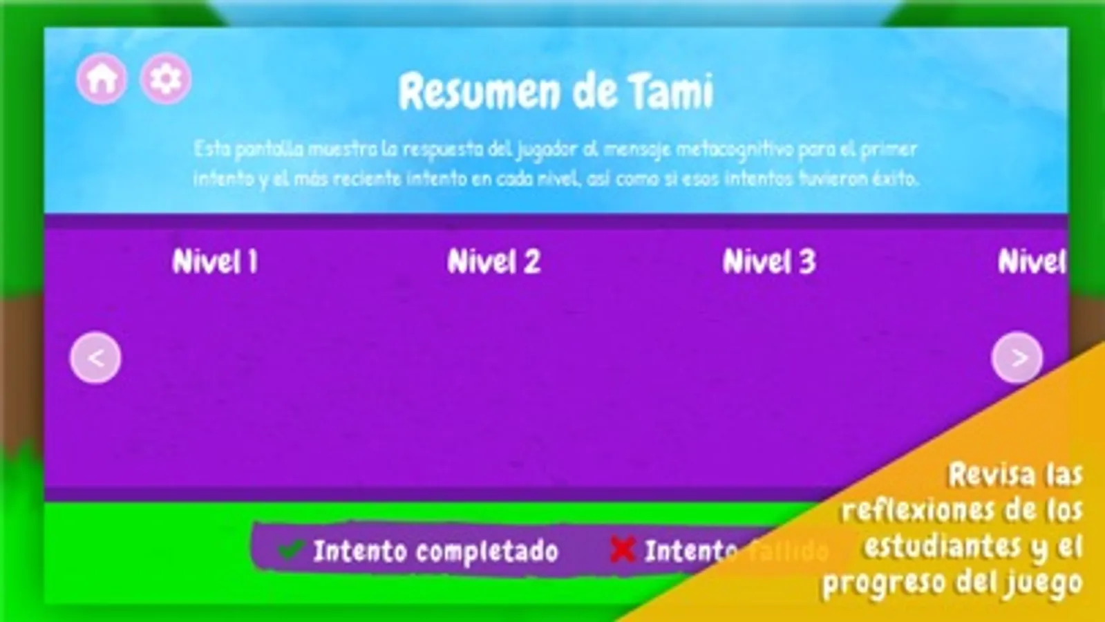 • Los maestros pueden evaluar las respuestas de los estudiantes a las preguntas metacognitivas a través de la pantalla de final del juego