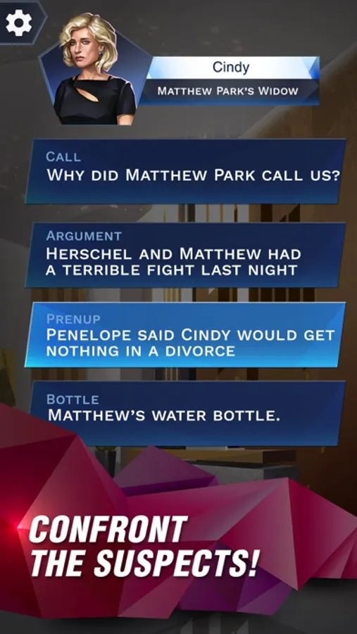 Find clues by talking to suspects and investigating whether their alibis hold up. Did anyone actually witness the murder? Every character has secrets - can you determine which are relevant to solving the case? Confront suspects with evidence to find their motives and make them come clean!