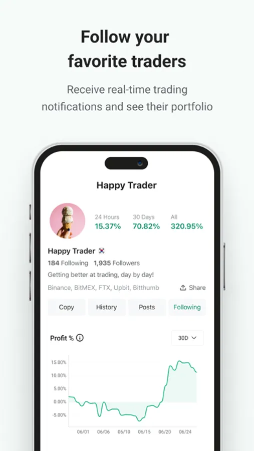 Want to be notified whenever the best traders make a trade? Click into any portfolio and then select “follow” for real-time notifications about others’ trading activity. Refine your crypto trading strategy with their expertise.