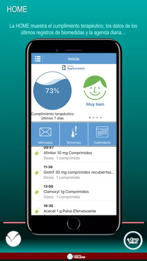 • AGENDA: En formato diario y mensual avisa de las tareas y permite registrar la actividad programada (tomas de medicamentos, controles y citas).