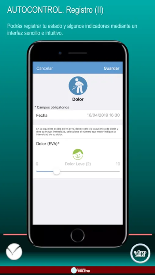 • AUTOCONTROL: Este módulo permite controlar periódicamente las principales biomedidas, como peso, tensión arterial, frecuencia cardiaca, temperatura, etc. Incluye además registros de estado general, control de dolor y otros cuestionarios de evaluación y cumplimiento terapéutico.