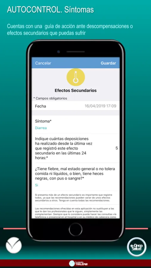 • SÍNTOMAS y EFECTOS ADVERSOS: El paciente cuenta con un protocolo específico de actuación ante la aparición de síntomas o descompensaciones. Una vez registra un efecto adverso, e-Onco Salud le va preguntando y guiando en función de sus respuestas. Permite insertar imágenes y ficheros multimedia, especialmente interesantes en las alteraciones de la piel.