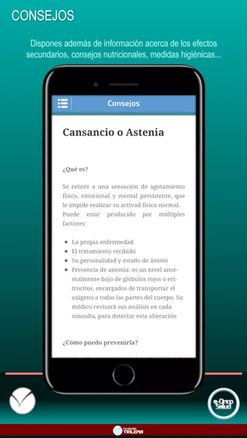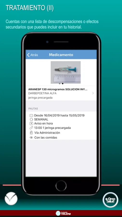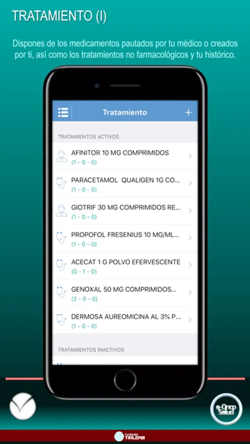 • TRATAMIENTO: e-Onco Salud es una herramienta de ayuda para gestionar tu tratamiento farmacológico, permitiéndote planificar y validar las tomas de los fármacos en cada momento. Desde la aplicación podrás también añadir otros fármacos y tratamientos. Contiene información, fotografías, prospectos y recomendaciones sobre el tratamiento farmacológico, así como precauciones a tomar e información sobre posibles interacciones.