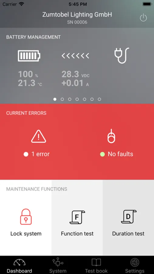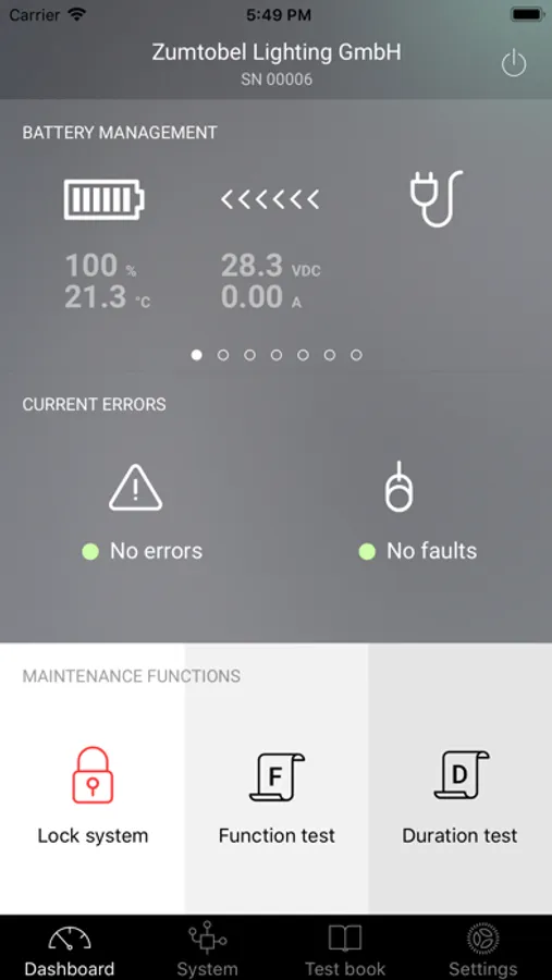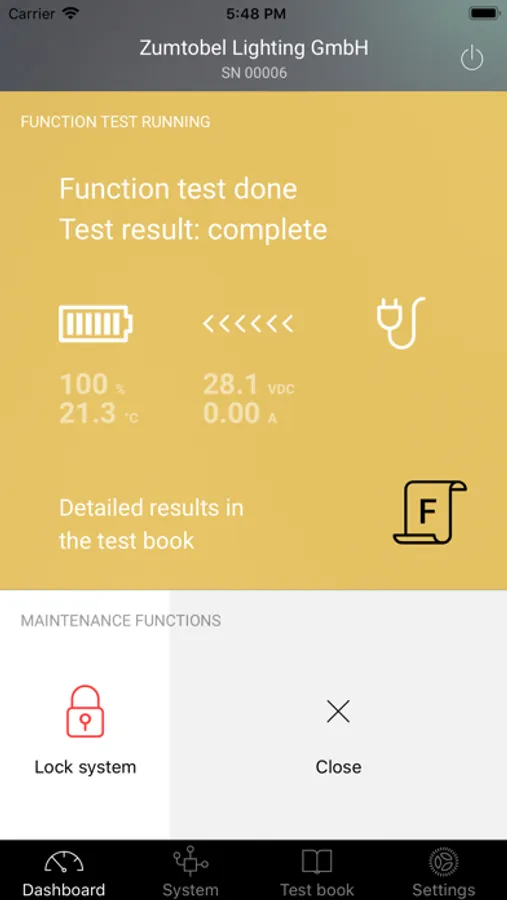 Maintenance of the systems can also be carried out with the nBox app. Functional and duration tests can be triggered quickly and easily. All system tests are clearly documented in the digital test book.