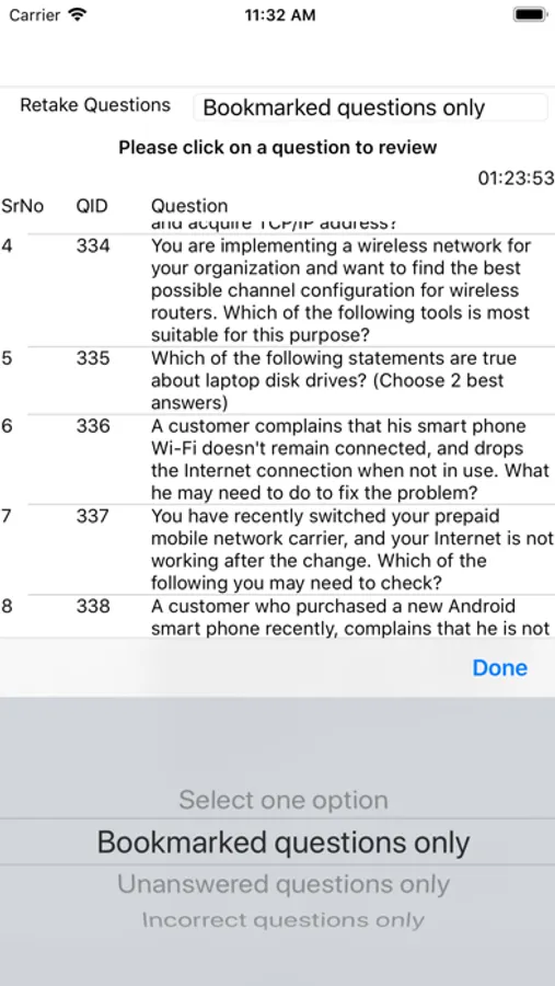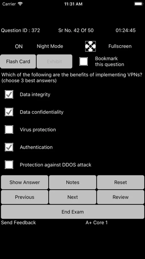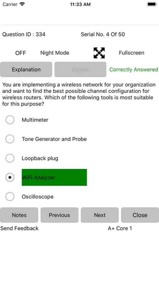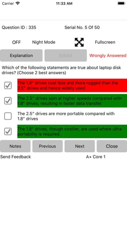 Complete explanation is provided for each question in Learn mode, and actual exam environment is simulated in Exam mode. Options to save the results and reviewing questions are provided.