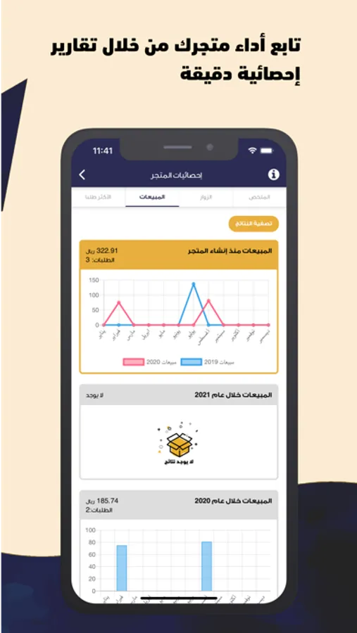 - تتابع حالة متجرك العامة، وتشوف إحصائيات متجرك (عدد الزيارات، والمنتجات المفضلة، والمبيعات في متجرك، وحتى السلات المتروكة) حتى تقدر تتعرف على مكامن القوة في مشروعك!