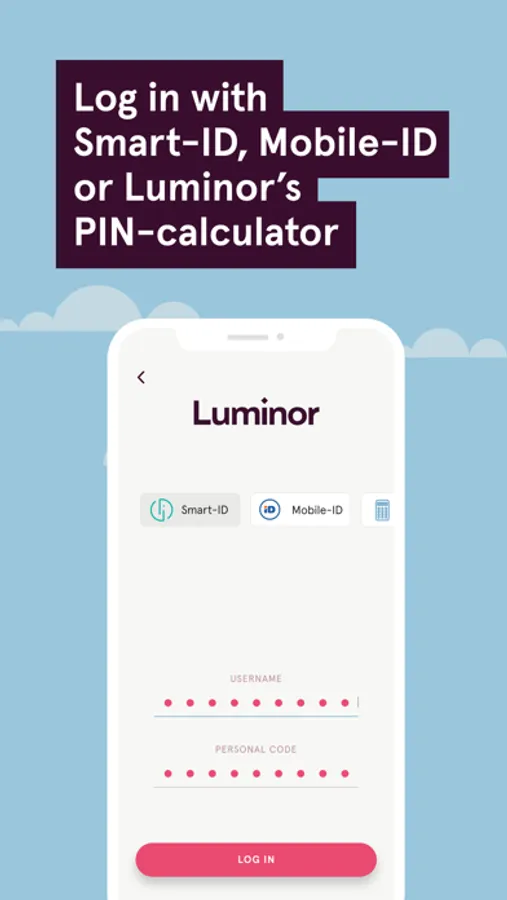 Sisene äppi Smart-ID, Mobiil-ID või Luminori PIN-kalkulaatoriga. Kaitse oma telefoni alati ekraanilukuga.